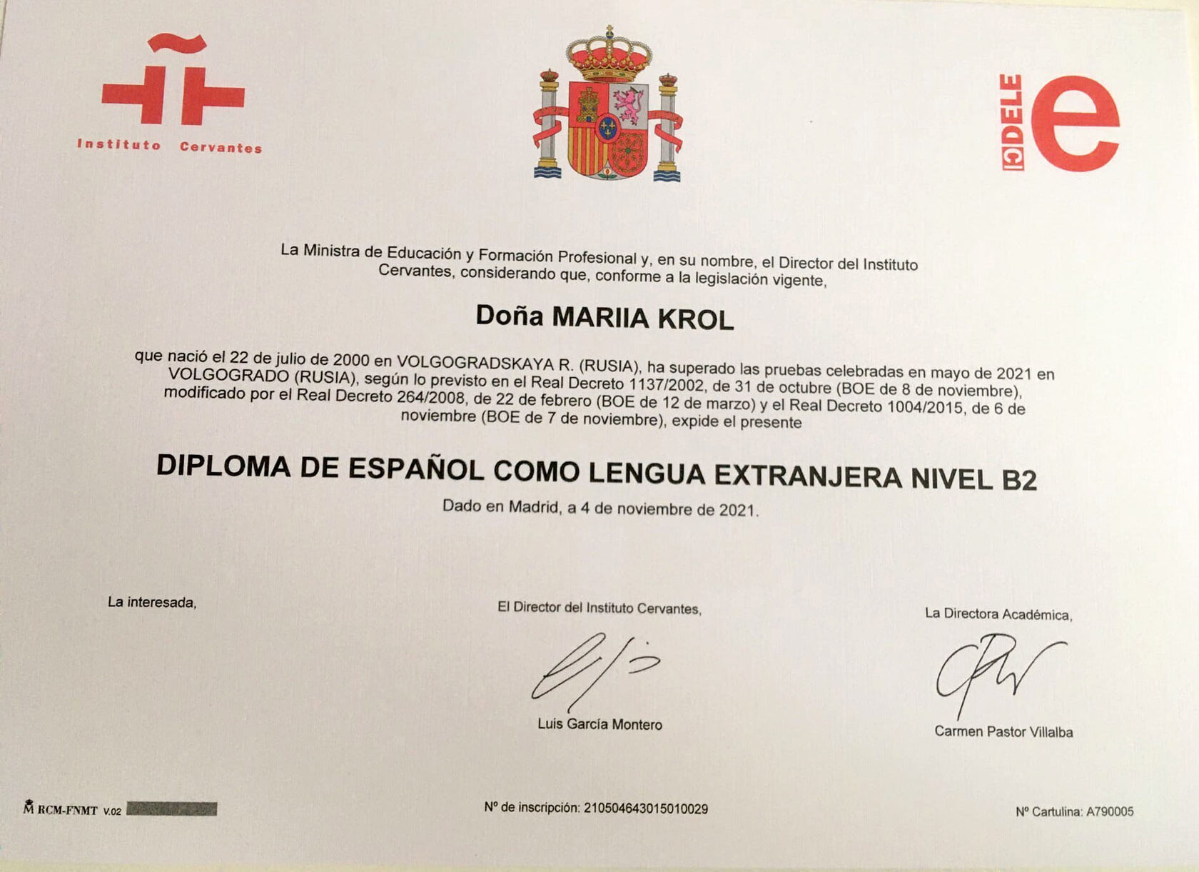 Сертификат DELE B2 (2021)