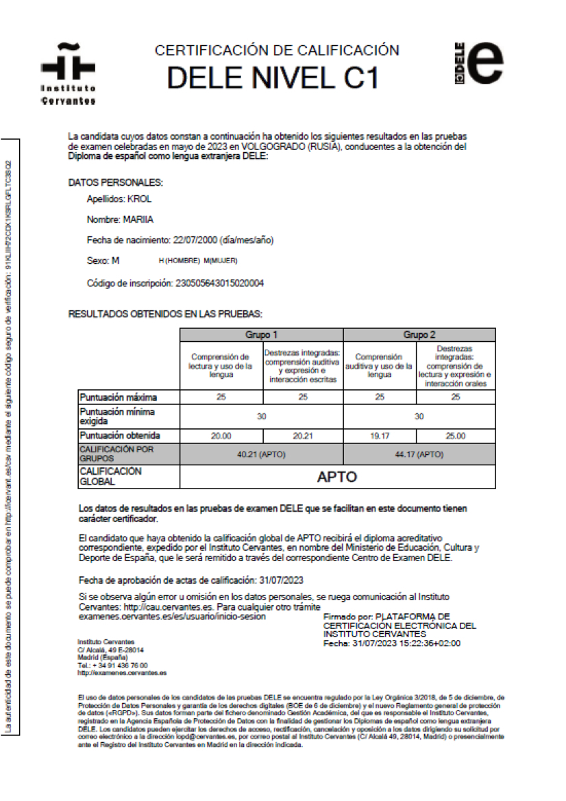 Сертификат DELE C1 (2023)