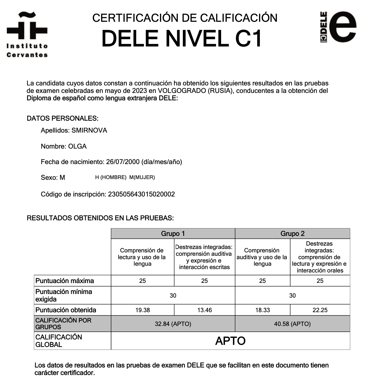 Закончила Волгоградский государственный социально-педагогический университет: “Педагогическое образование с двумя профилями подготовки “Испанский язык”, ”Английский язык”.